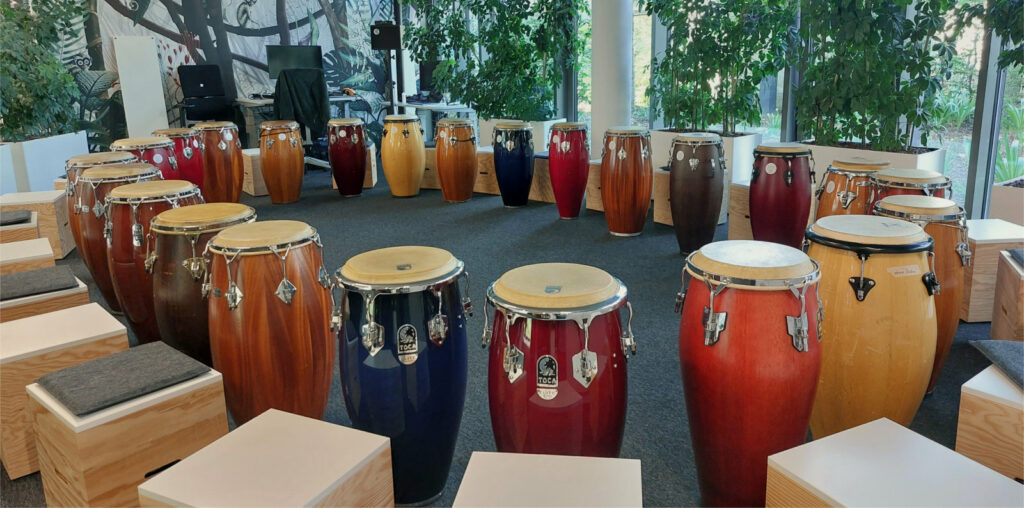 Eine wertschätzende Atmosphäre ist natürlich die Voraussetzung, um gegenseitiges Zuhören und Offenheit bei der Interaktion einzuladen. Dabei werden die Teilnehmenden spielerisch an Grenzen der Wahrnehmung herangeführt. Sie lernen auf Handtrommeln verschiedene Rhythmen, die später in der Gruppe verteilt zu einem mehrstimmigen Groove verschmelzen. Eine gemeinsame Improvisation zum Abschluss ist immer einzigartig und zugleich eine besondere Erfahrung der Selbstwirksamkeit.